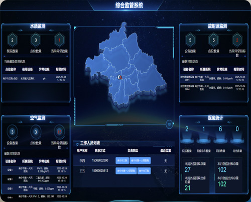 智慧卫监综合监管平台构建了一体化监管体系。该平台整合医疗废物监管、放射源监管、游泳场所在线监测、生活饮用水监管、污水排放监管、医疗机构灭菌消杀监测、公共场所空气质量监管、职业病危害要素监测、职业卫生管理评价、执法记录等十大核心子系统,实现三级权限闭环管理,为监管机构打造高效协同的一站式综合监管中枢。